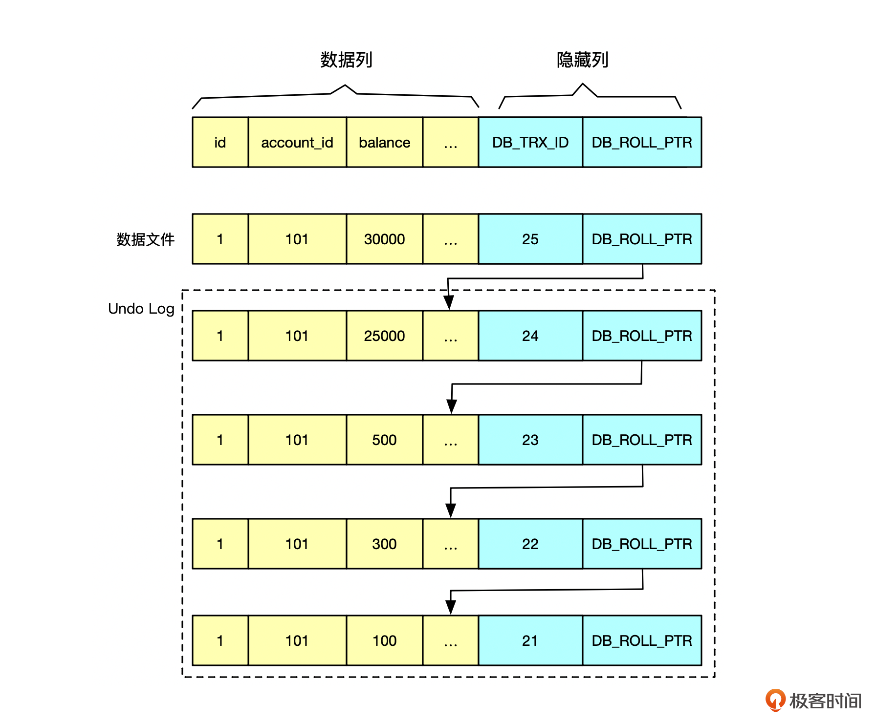 为了实现 MVCC,InnoDB 引擎给每一行都加了一些额外的字段: